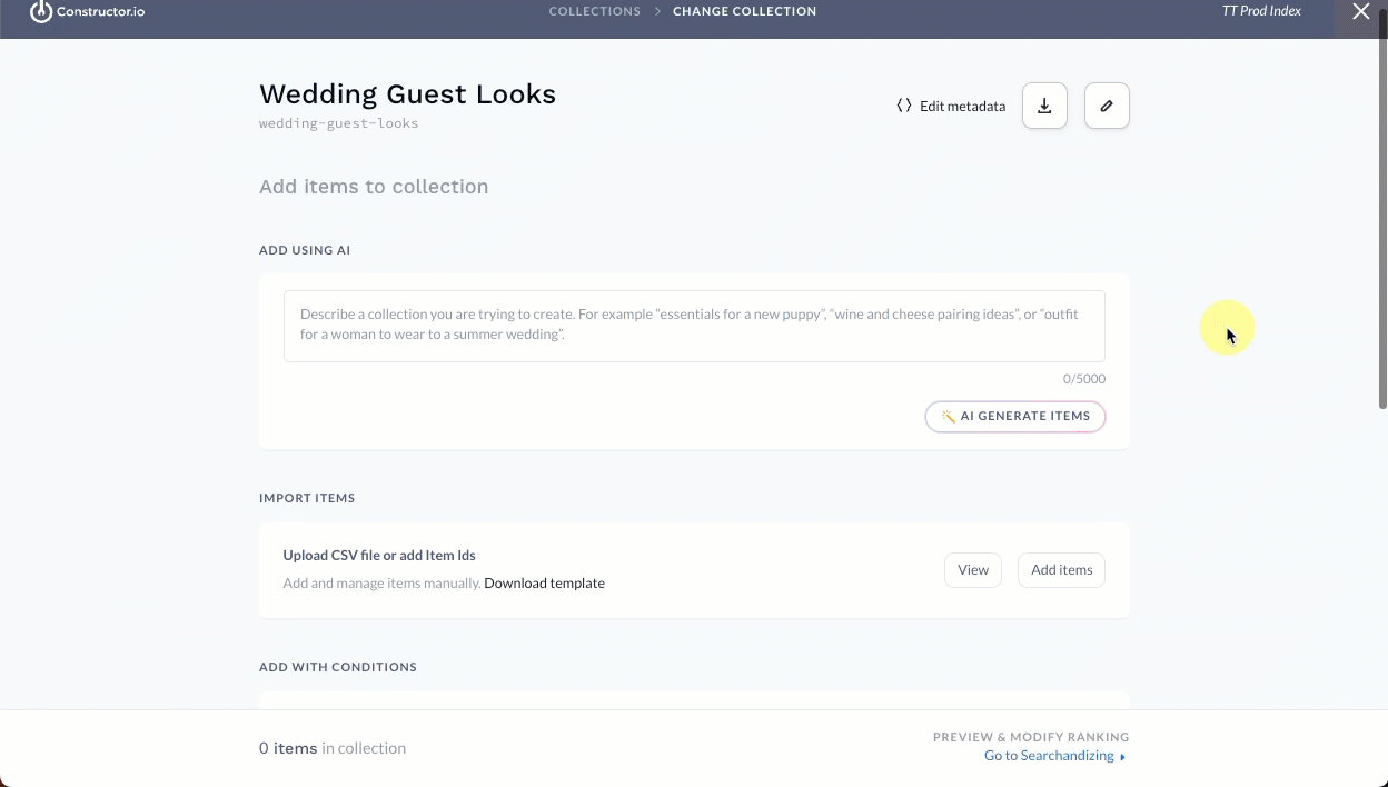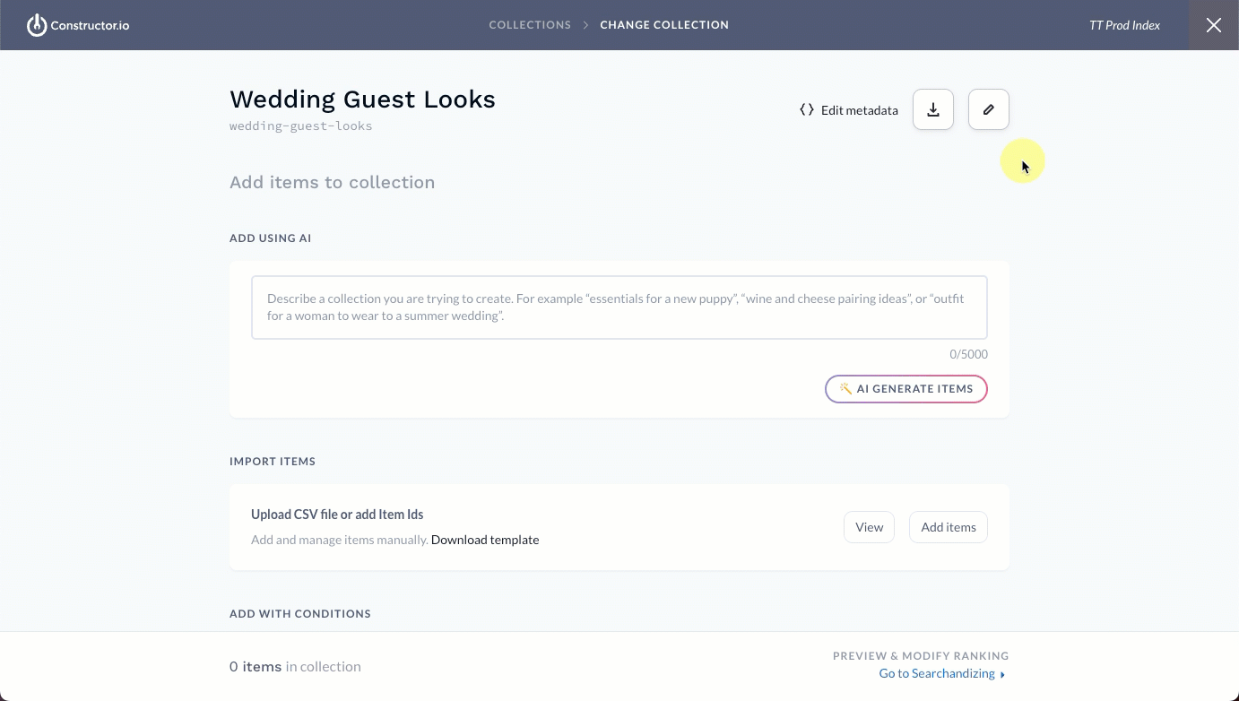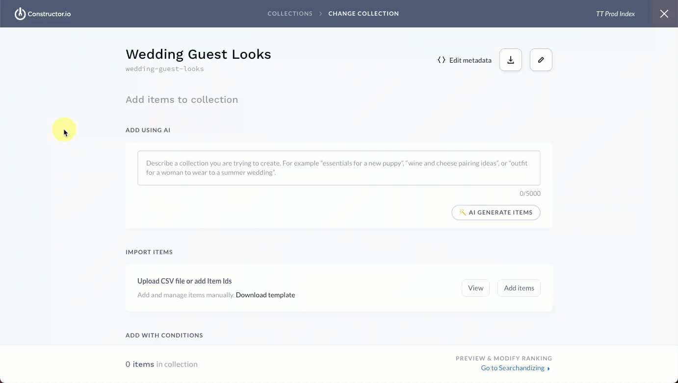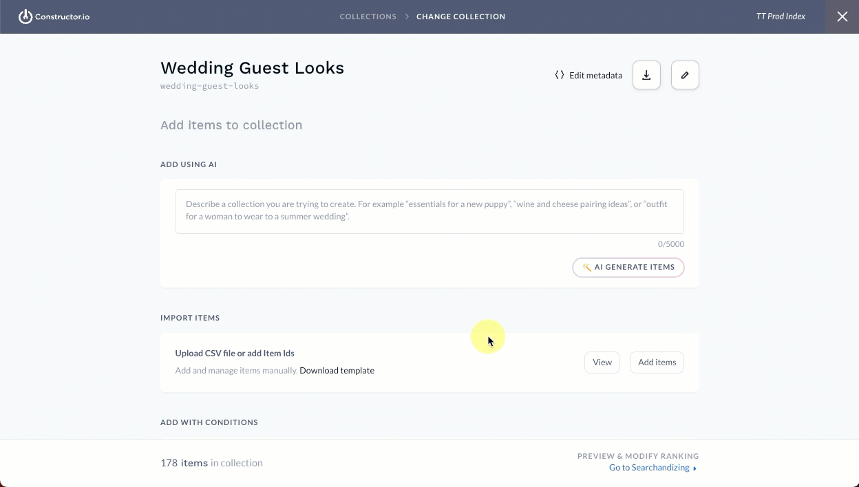 You can create a collection using an AI prompt. Here you can enter context for a collection (i.e., “Collection of outfits men can wear to a summer wedding. Items should be formal or semi-formal, not casual”), a list of ideas for items to be included in the collection (i.e., “Collection of holiday gift items like personal electronics, electronics for travel, or electronics under $50"), and more.