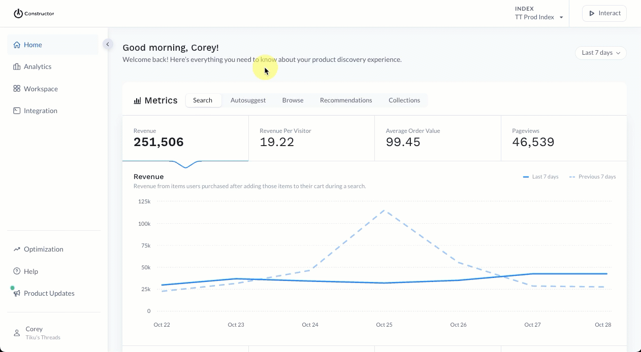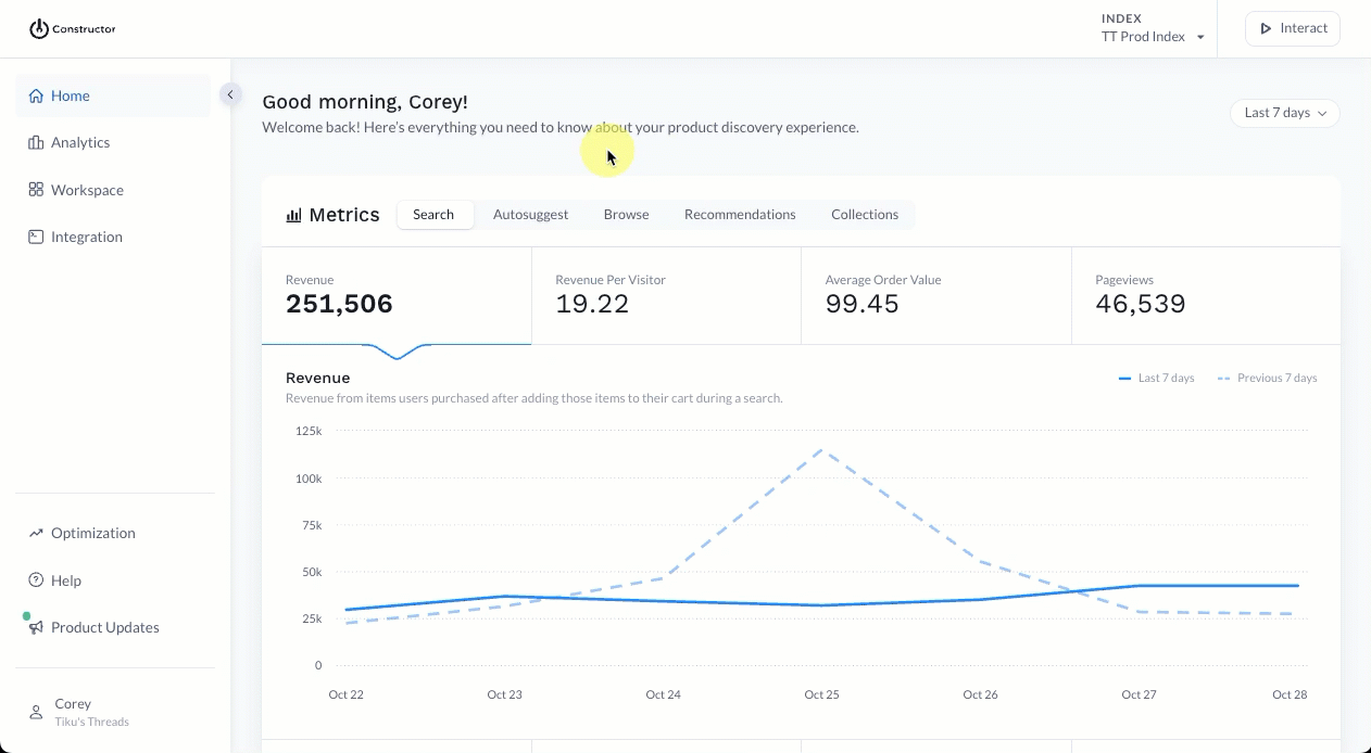 Viewing collections in Interact allows you to see how Constructor’s algorithm ranks items in the collection. Additionally, you can impersonate different users or user segments to see how ranking changes based on the learnings associated with the user or segment.