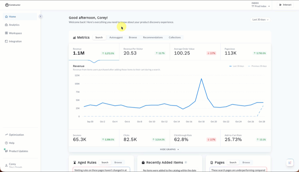 - Select Workspace in the side menu of your Constructor dashboard, then select Indexes.