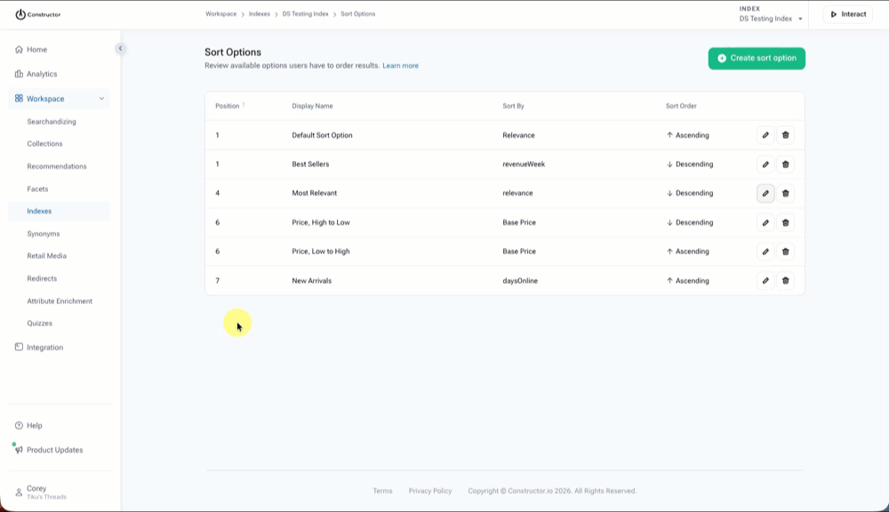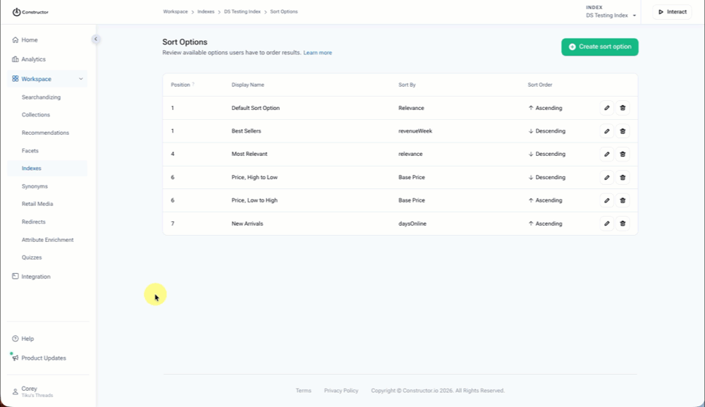 Create, update, or delete sort options in the Constructor dashboard.