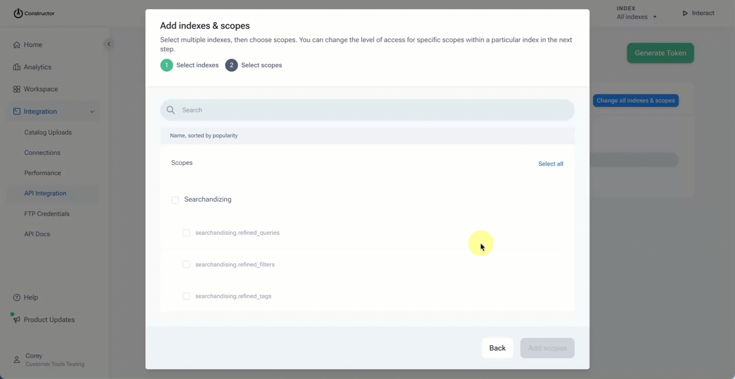 Scopes grant access to specific endpoints that require authentication. When you select one or more scopes, you are allowing the token to access those endpoints. Keep in mind that these scopes will be specific to the index(es) you selected in the previous step.