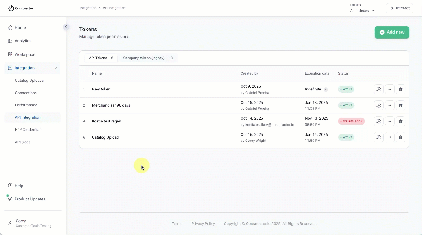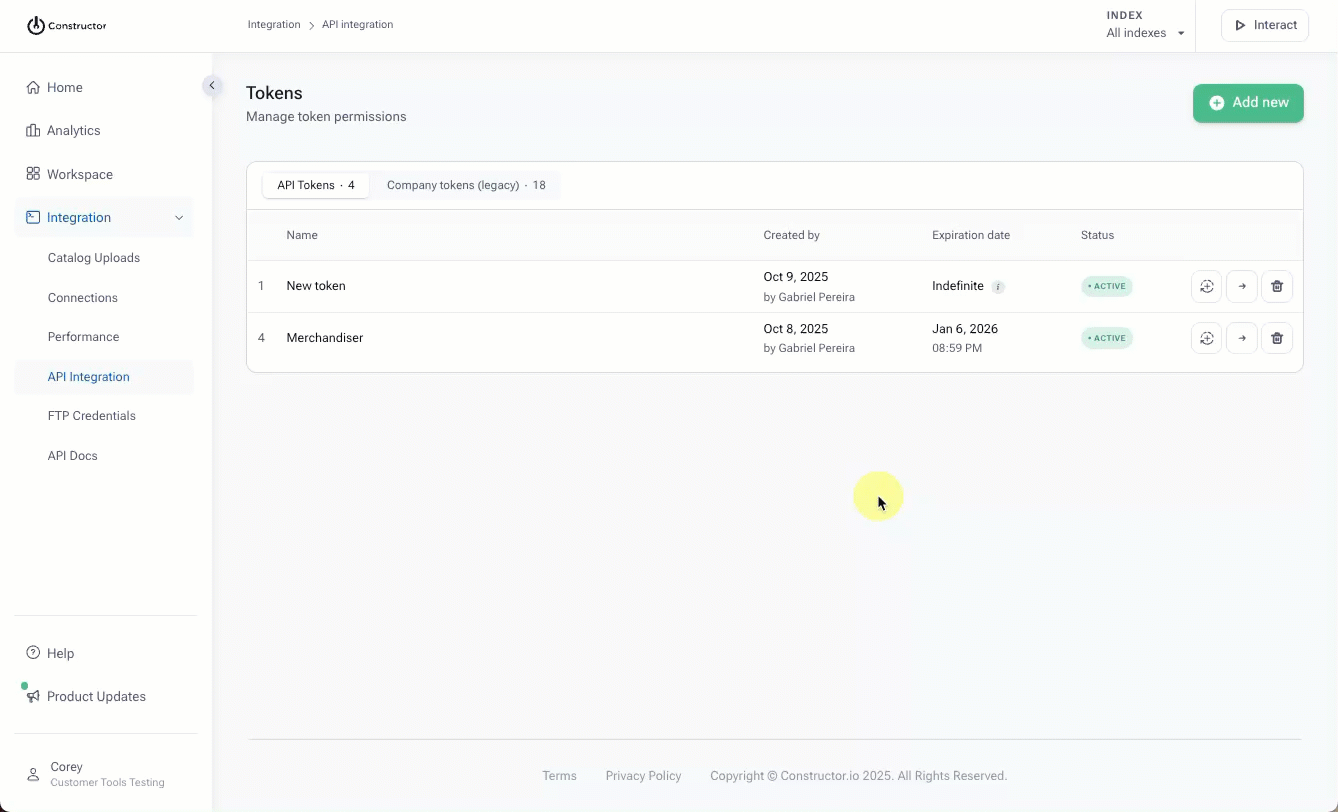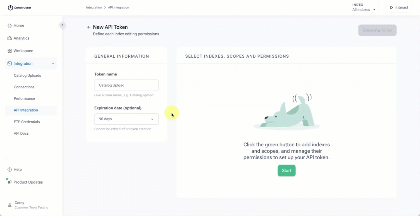 - Create a token for a specific integration. For example, a token used to allow a specific system to integrate with Constructor.
