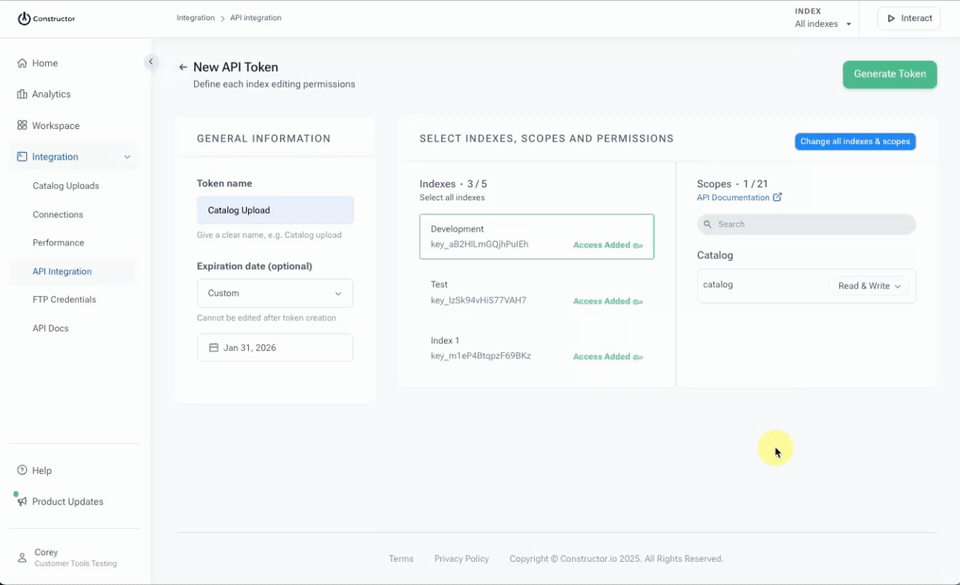 Do note that a single token can provide access to multiple index + scope + operation scenarios. Meaning, a token could provide read and write access to the catalog upload endpoint in the Production US index and provide write access to the catalog upload endpoint in the Production CA index. This is something you and your team can configure using the steps outlined in this article.