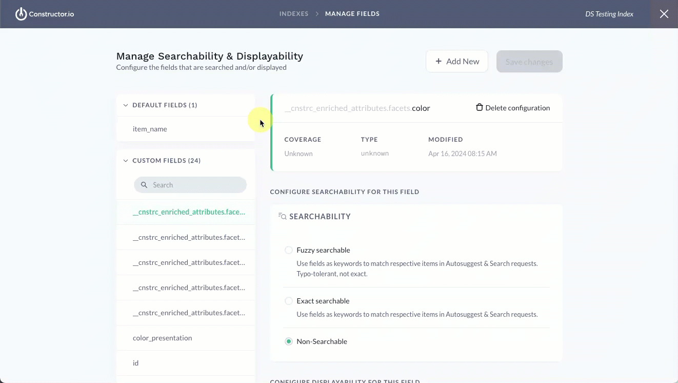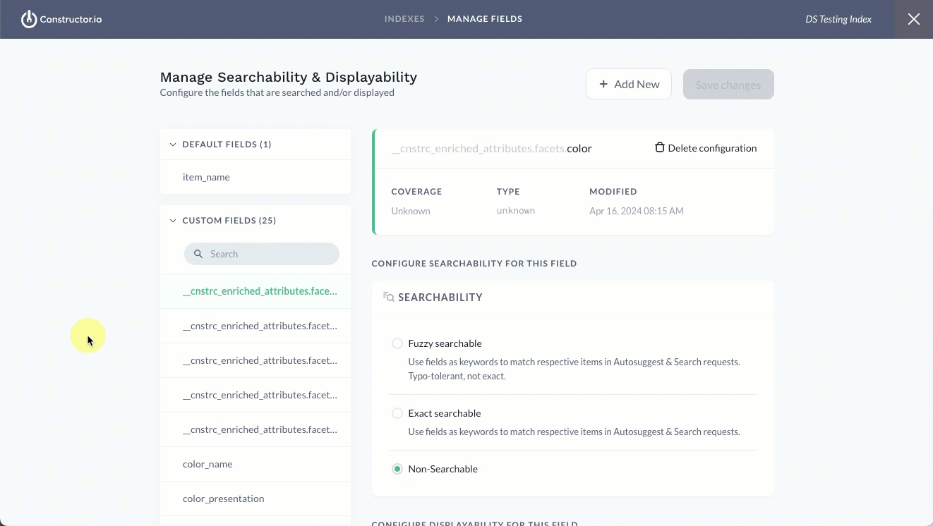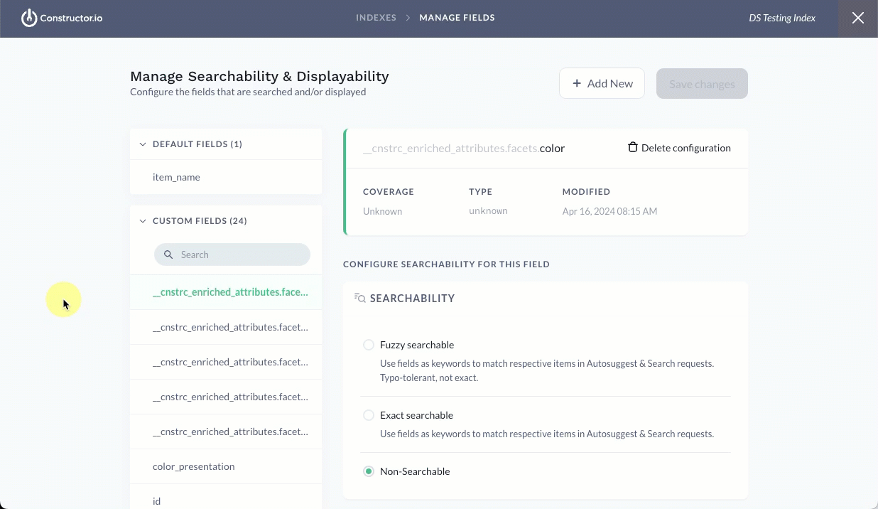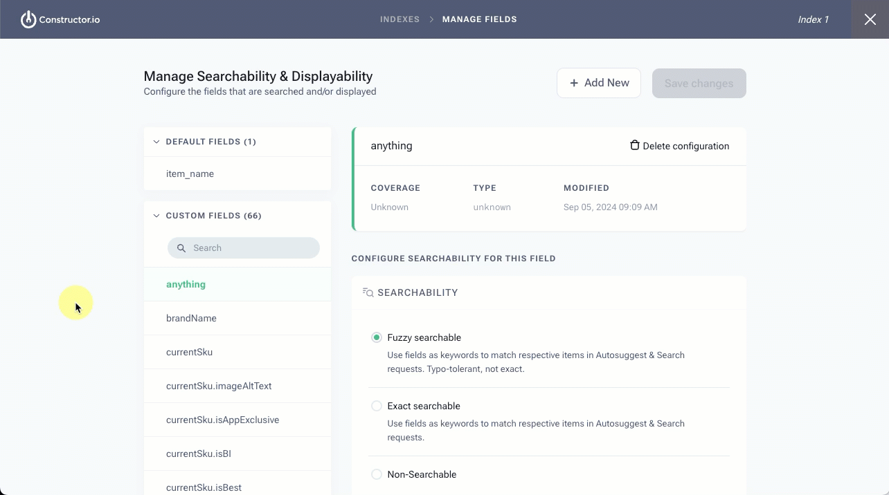 There are three levels of searchability in Constructor: fuzzy, exact, and non-searchable. By default, newly added catalog fields are marked as non-searchable.