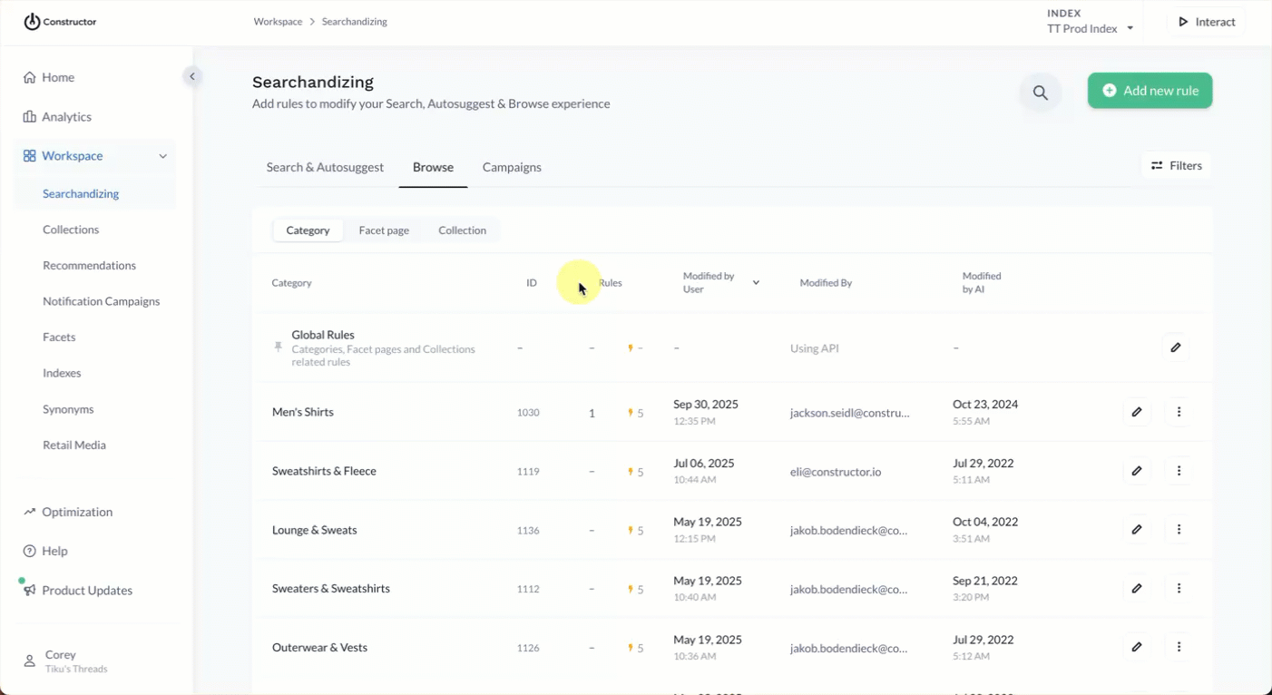 Automatic rules live next to manual rules in the searchandising menu, and merchandisers can manually delete these rules if desired.