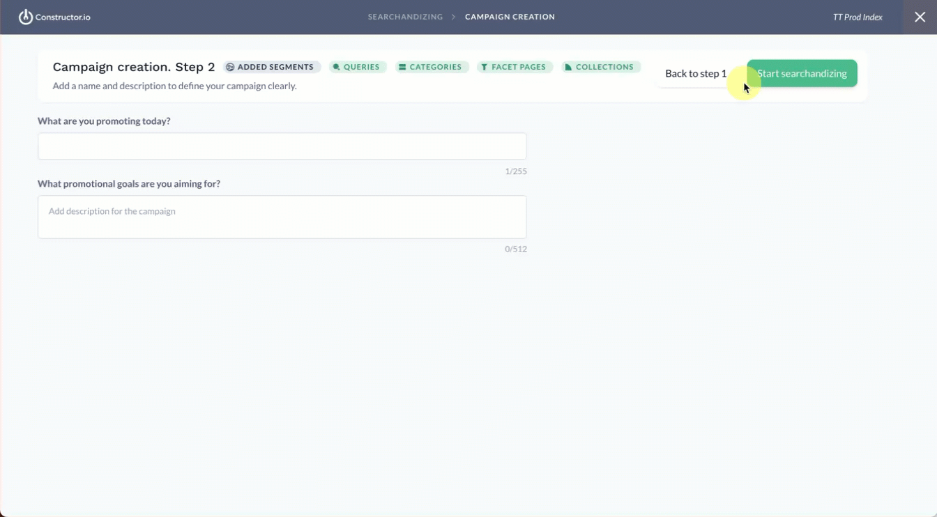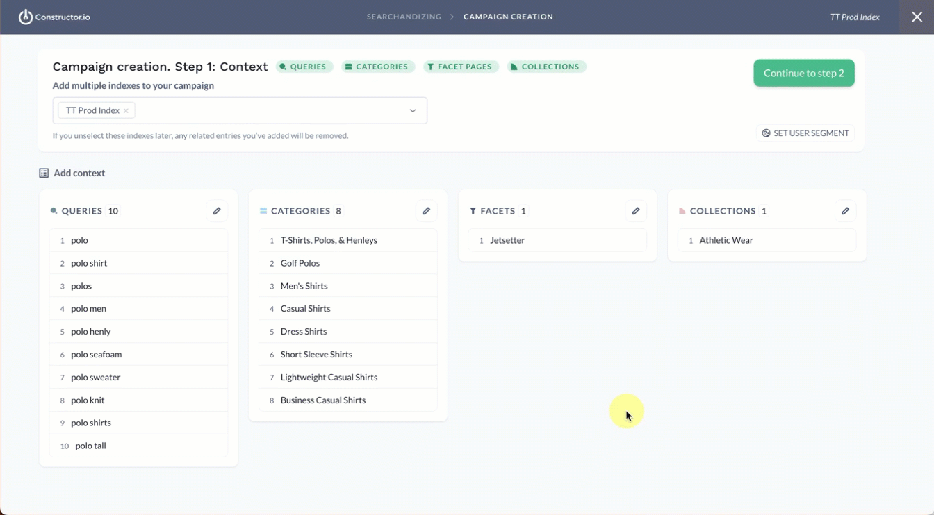 In this step, you’ll select the various contexts you want included in your campaign. This can be a mix of query, category, collection, and facet pages, or simply multiple queries, multiple category pages, multiple collections, or multiple facet pages.