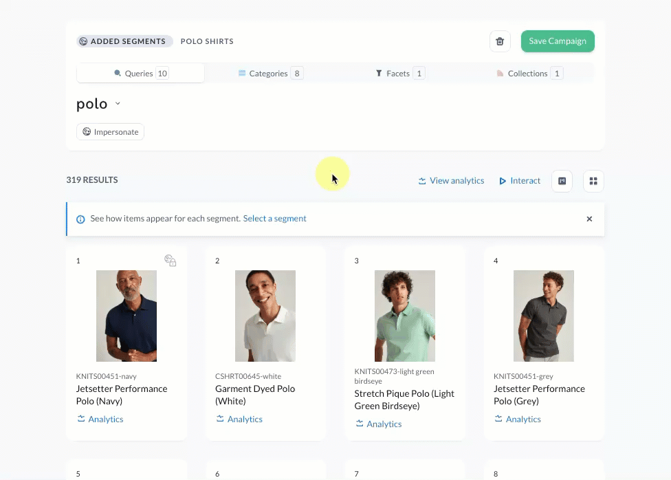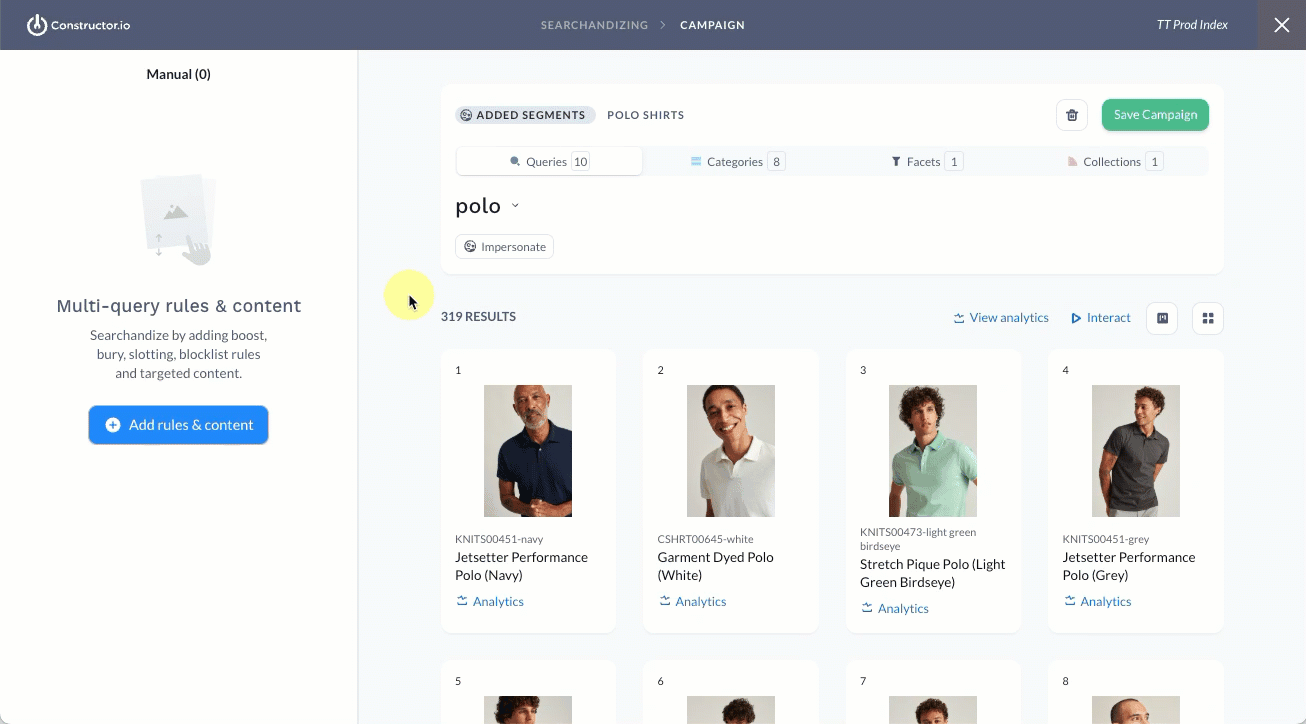 With slotting rules, you can slot an item into a specific position across all of the selected contexts. For example, a blue cotton polo shirt slotted into position #2 will show in that position for all queries, category pages, and facet pages included in the campaign.