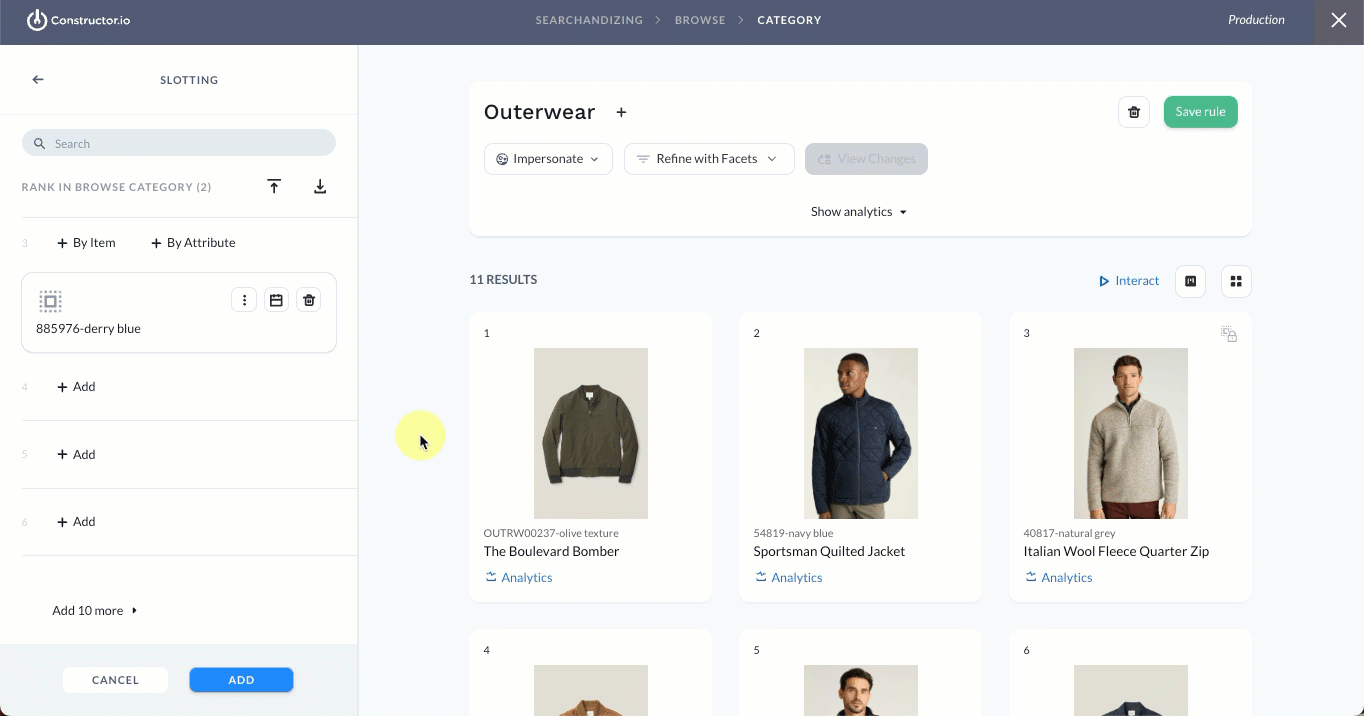 Want to slot a future item in a recommendation pod?You can access the searchandising menu for a specific pod from the Recommendations section of the Constructor dashboard. Select Add new in the top-right corner, then Recommendations rule. From there, select your desired pod.